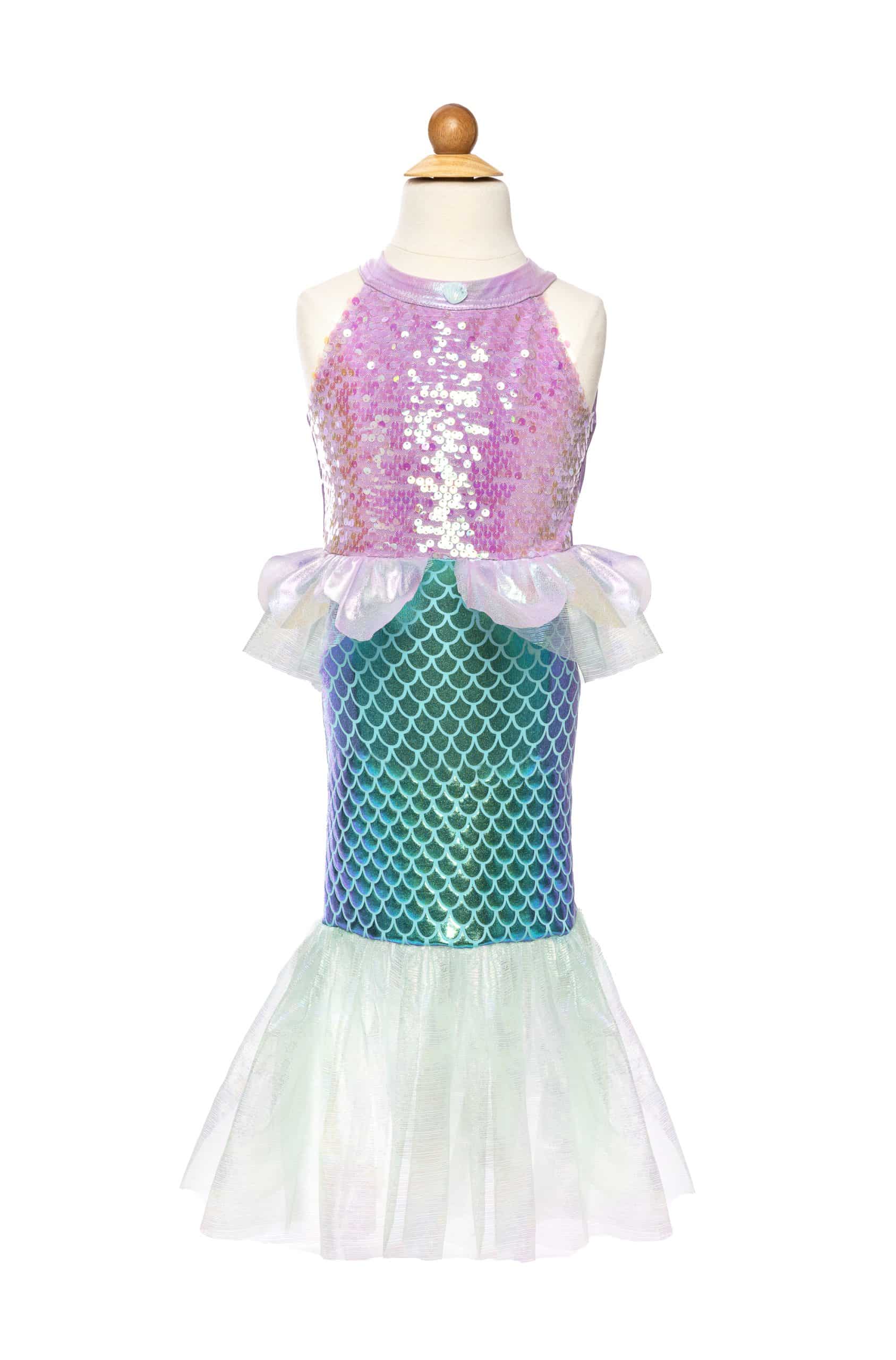 Deze zeemeermin jurk is een echte blikvanger voor kinderen die graag in een fantasiewereld duiken. Het jurkje heeft een paarsroze top met glanzende pailletten, een speelse tailleafwerking en een aansluitende rok met schubbenprint in blauw en groentinten. De zachte tule zoom zorgt voor een mooie zeemeerminlook. Perfect voor verkleden, kinderfeestjes of carnaval.